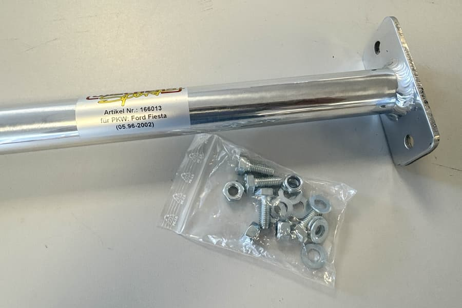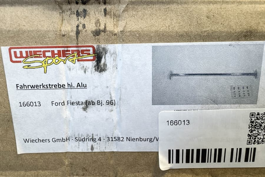Neue Wiechers-Sport Fahrwerkstrebe hinten aus Aluminium, passend für den Ford Fiesta ab Baujahr 1996. Die Strebe erhöht die Stabilität der Hinterachse und verbessert das Fahrverhalten, insbesondere bei sportlicher Fahrweise.
