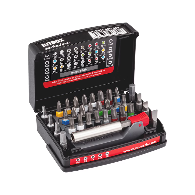 Die Würth Bitbox Größe 3 ist ein umfangreich bestücktes Profi Bit Sortiment für Montage Werkstatt und Service. Das Set enthält 33 Bits mit den gängigen Abtriebsarten PH PZ TX Innensechskant und Schlitz sowie einen magnetischen Universalhalter.