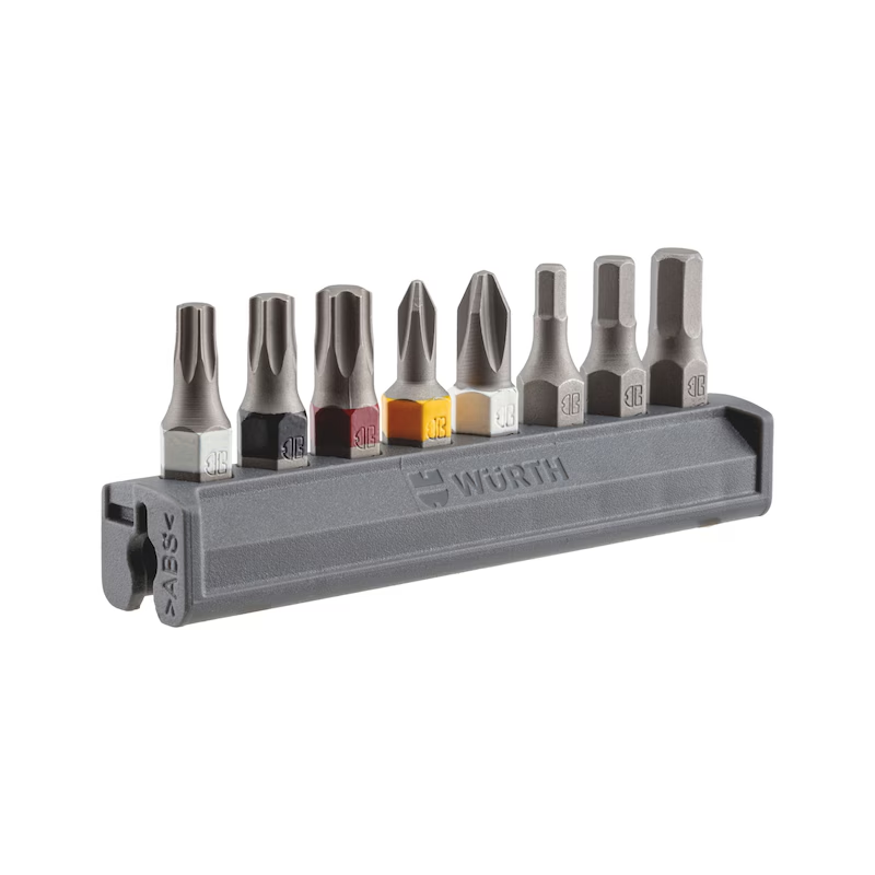 Die Bits sitzen sicher im Bitriegel und fallen nicht heraus, lassen sich jedoch leicht entnehmen. Das Würth Farbleitsystem ermöglicht eine schnelle und eindeutige Identifikation der richtigen Bitgröße. Durch das kompakte Würth Rastermaß lässt sich der Bitriegel problemlos in Systemkoffern oder Werkstattwagen integrieren.