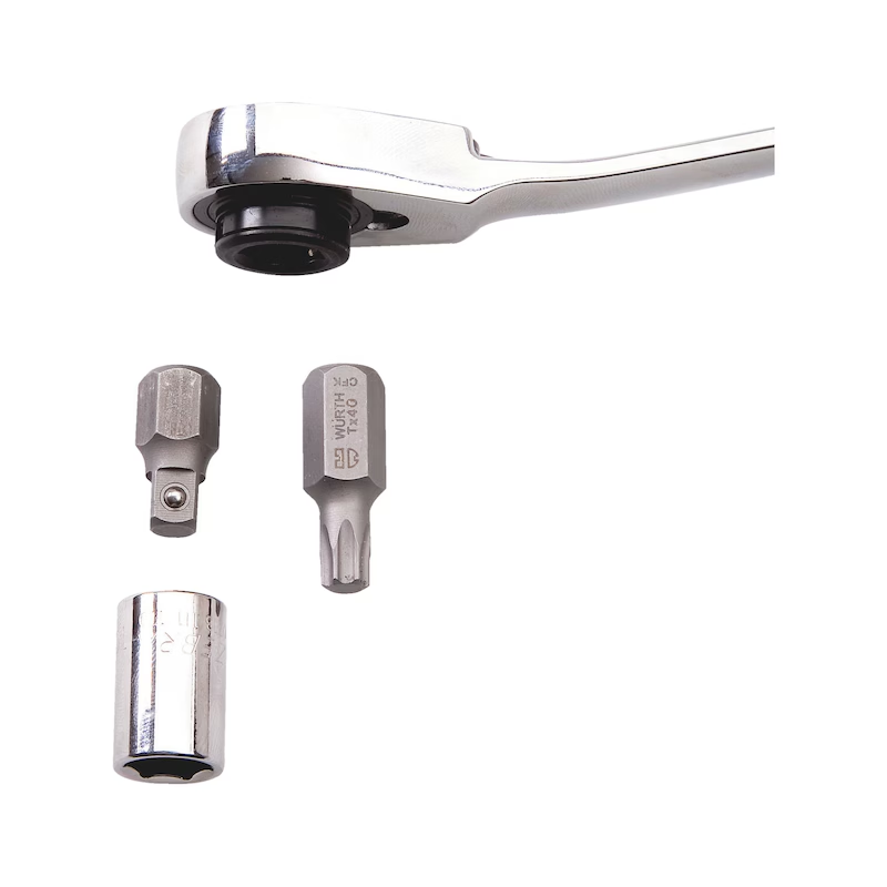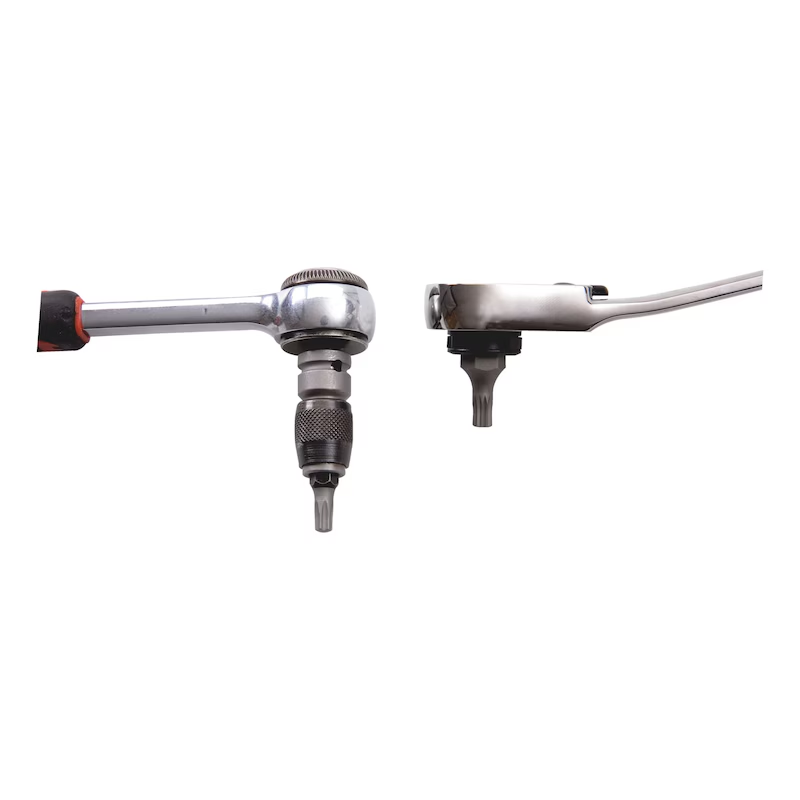Umfangreiches Spezialwerkzeugsortiment für Arbeiten bei sehr beengten Platzverhältnissen. Die besonders flache und gekröpfte Ratsche ermöglicht effizientes Arbeiten auch an schwer zugänglichen Stellen wie Türscharnieren, Motorräumen oder Zahnriemenabdeckungen. Die Kombination aus 1/4 Zoll und 10 mm Aufnahme erlaubt den Einsatz von Bits und Steckschlüsseleinsätzen.