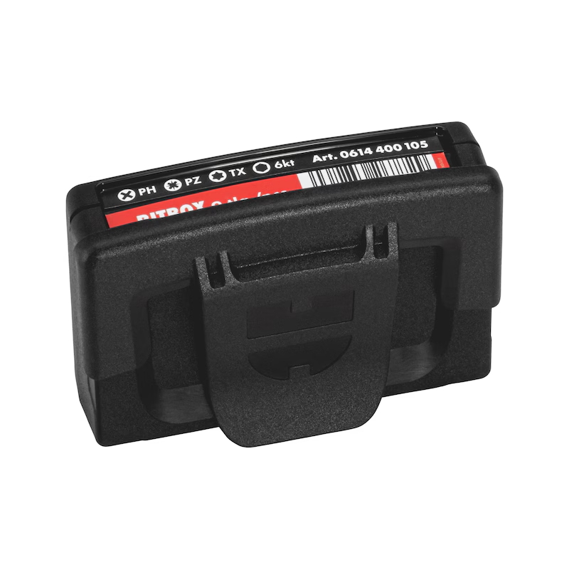 Der fest integrierte Bitriegel richtet sich beim Öffnen automatisch auf und ermöglicht einen schnellen, sicheren Zugriff auf alle Bits. Dank fester Klemmung sitzen die Bits sicher und lassen sich dennoch komfortabel entnehmen. Das Würth-Farbleitsystem erleichtert die sofortige Identifikation der passenden Bitgröße.